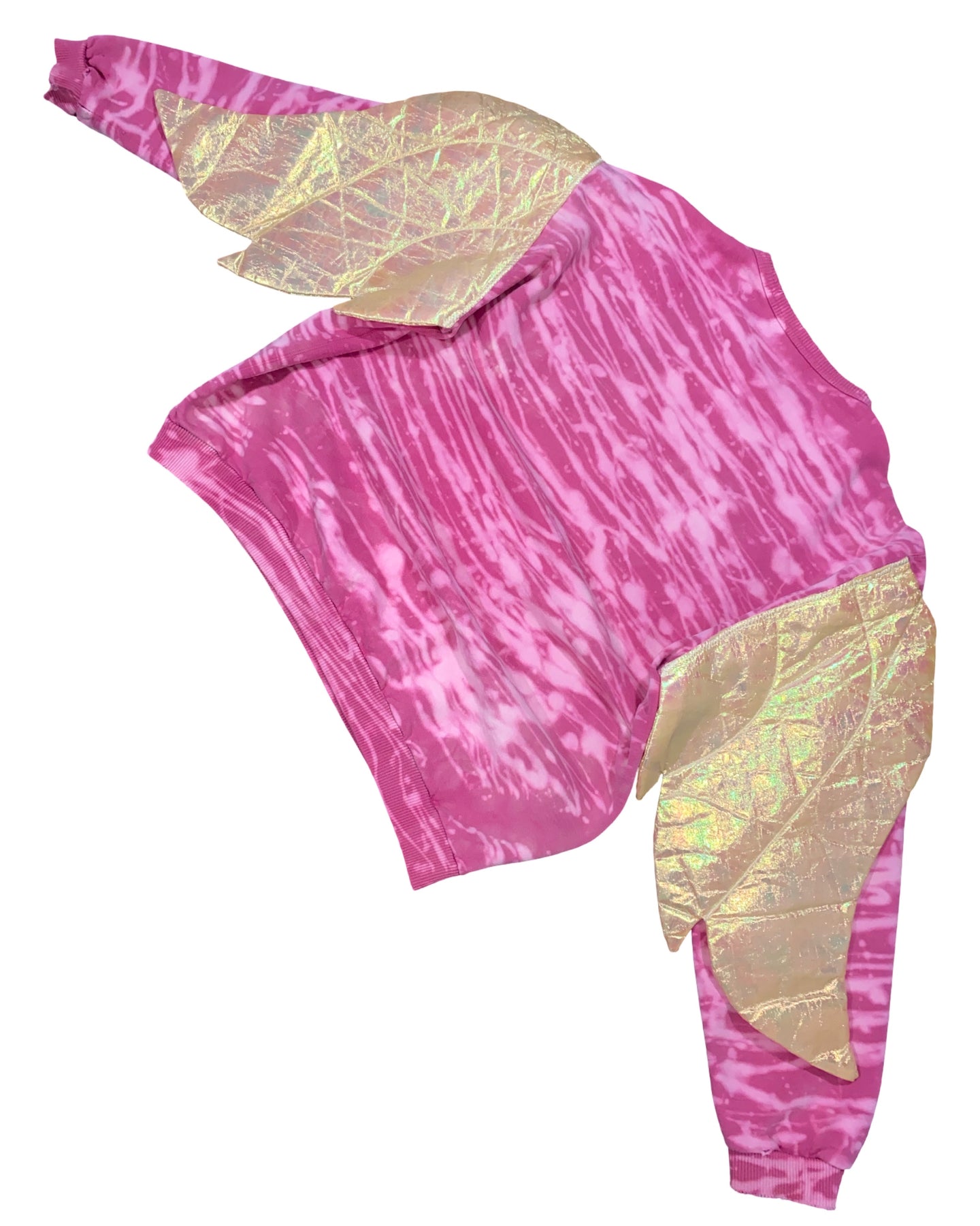 •reworked crewneck pullover, iridescent wings, varsity letters, featuring SD logo appliqué •made of preexisting material •100% unknown fibre •1 of 1 wearable artwork •designed by artist Danny Welsh