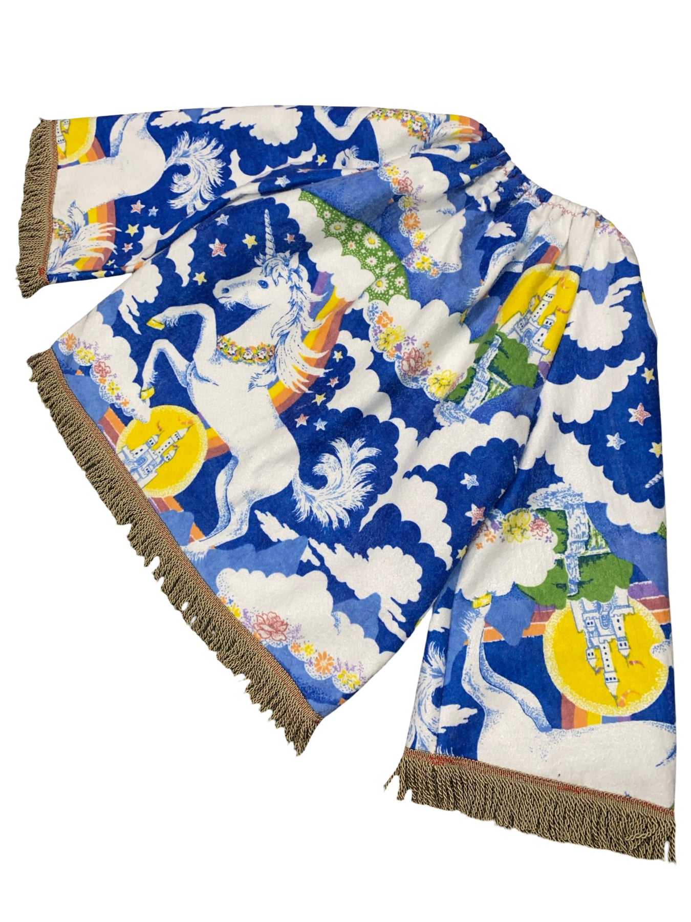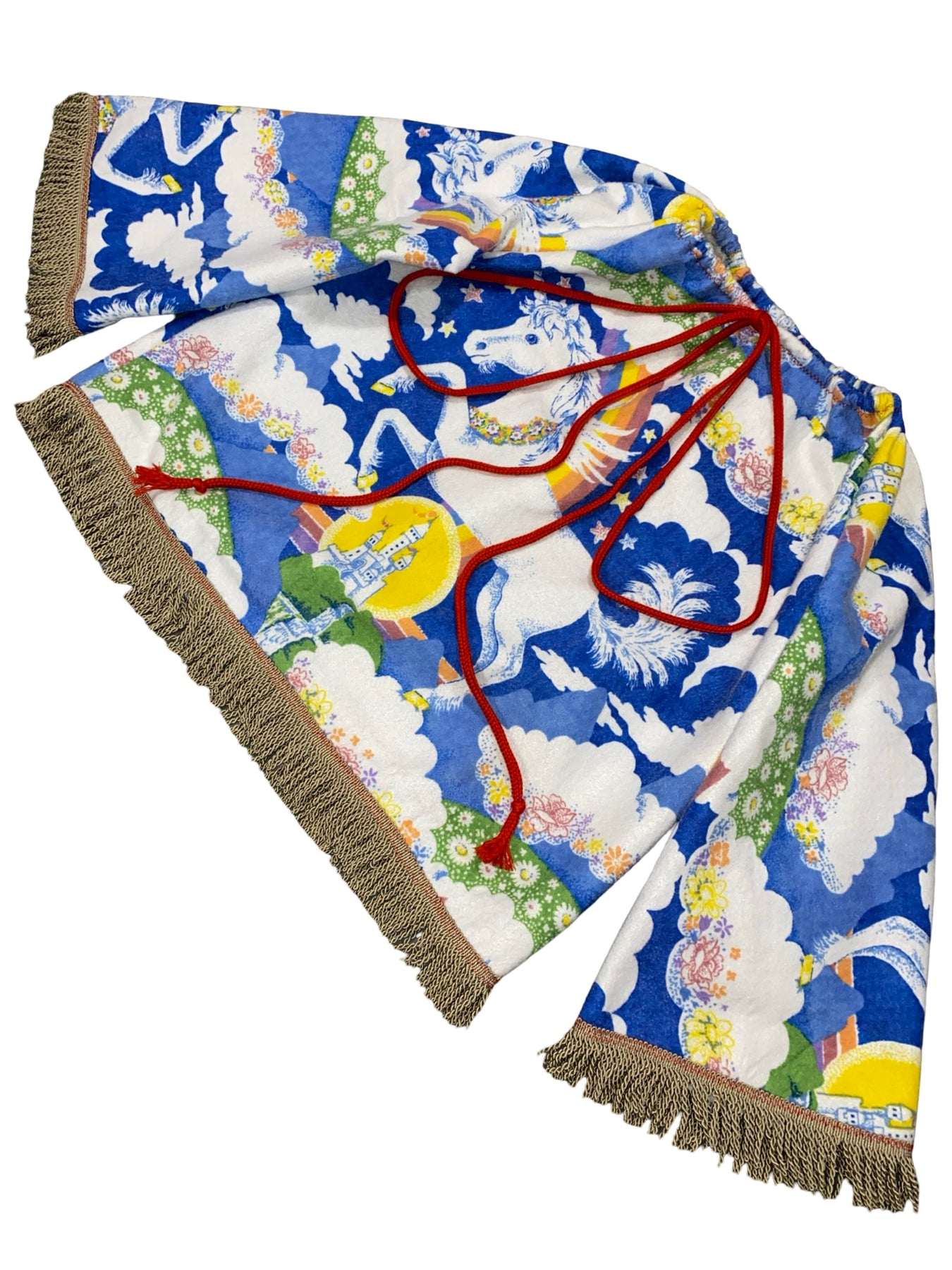 •reworked unicorn fantasy fabric, metallic gold fringe, red cotton cord•made of preexisting material •100% unknown fibre •1 of 1 wearable artwork •designed by artist Danny Welsh