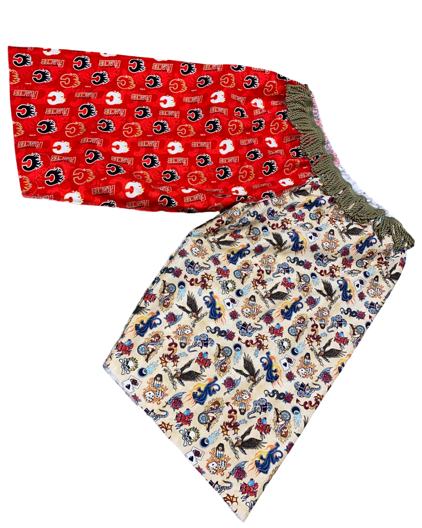 •reworked fabric, fringe, rope, featuring adjustable waistband